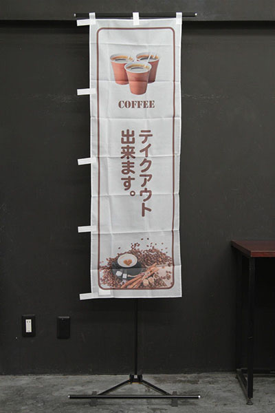 「テイクアウト出来ます。(白)」のぼりです。白地に大きな文字で目を引きます。写真も入りとても分かりやすいです。英字は「COFFEE」です。背景がコーヒー色の色違いもあります。