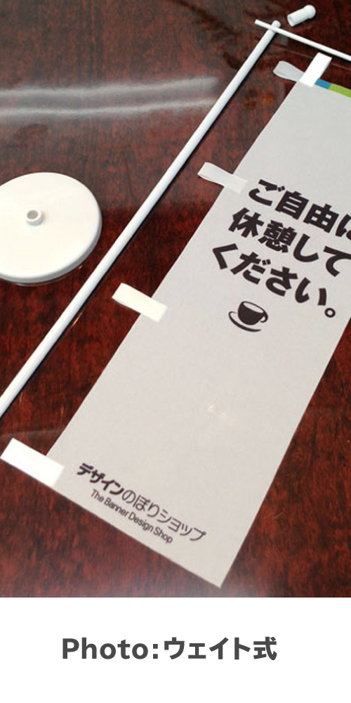 のぼり旗は折り畳んだ状態で納品しています。折りジワが気になる場合は当て布をしてのぼり旗のウラ面から「低温」でアイロンをかけてください。通常の生地(テトロンポンジ)は温度が高くなると縒(よ)れる場合があります。自己責任で慎重におこなってください。
