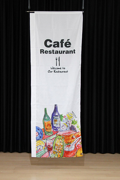 のぼり旗の生地を袋状に縫製してポールを通す仕様です。ポールが見えないのでデザインをスッキリと見せることができます。風に対しても捲り上がりにくい特徴があります。お店のイメージを大切にされる方、洋風な業種の方に多く選ばれています。